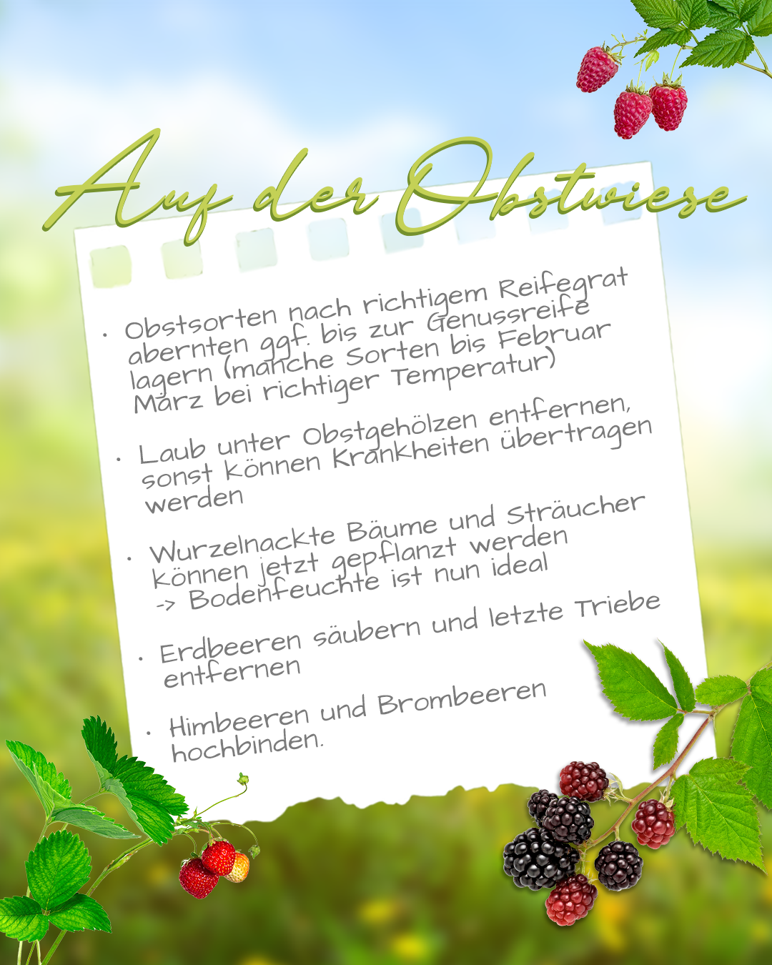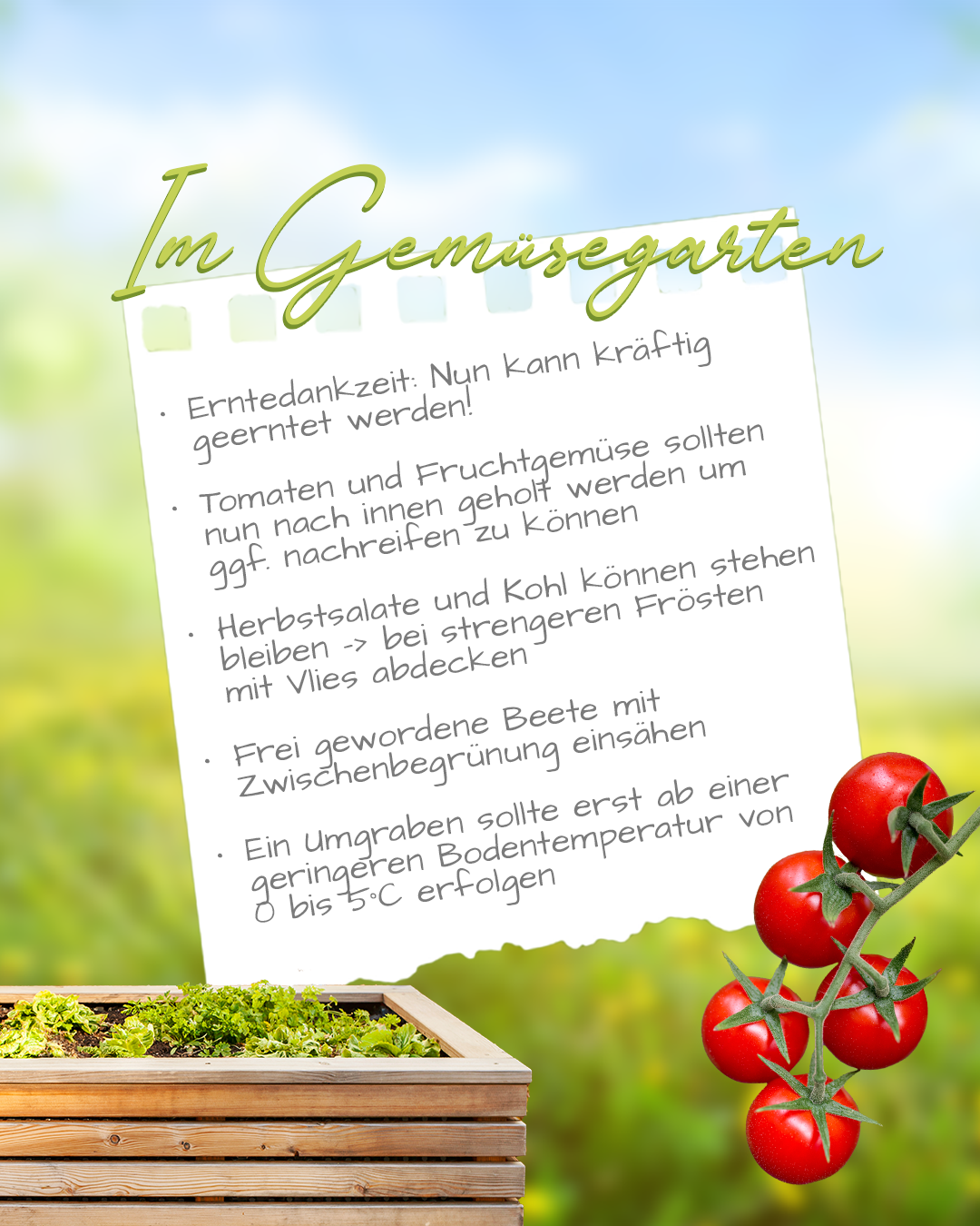 Der Oktober bringt kühles, nasses Wetter und neue Aufgaben im Garten. Dazu gehört die Ernte von Äpfeln, Birnen und Quitten. Jetzt bereiten wir Rasen, Zier- und Kübelpflanzen auf den Winter vor. Bei Zierpflanzen handelt es sich um Pflanzen, die wir wegen ihrer schönen Blüten oder Blätter anbauen. Kübelpflanzen sind Pflanzen, die in Töpfen oder Kübeln wachsen, oft weil sie nicht winterhart sind und im Haus überwintern müssen. Wir ernten die letzten Beete ab und säen Wintersalate.