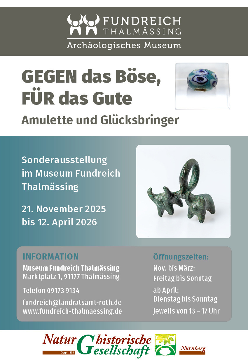 Die Sonderausstellung „Gegen das Böse, für das Gute!“ im Fundreich Thalmässing zeigt wie eng Amulette und Talismane seit der Vorzeit mit der Geschichte der Menschen verknüpft sind. Die Ausstellung, die von der Naturhistorischen Gesellschaft Nürnberg e.V. konzipiert wurde, bringt Glücksbringer aus allen Zeiten und Welten hervor.